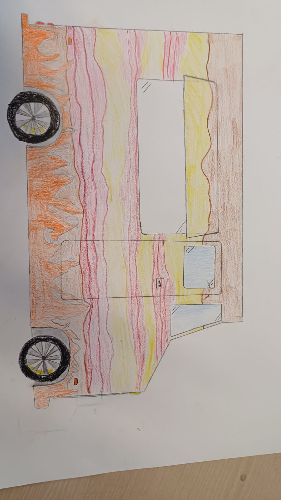 dit is onze foodtruck. Leon heeft hem geontwerpt. en Lars heeft hem daarna veder verwerkt. het is een bus net ham kaas en brood als kleuren. en natuurlijk vuur. deze truck is echt on fire!